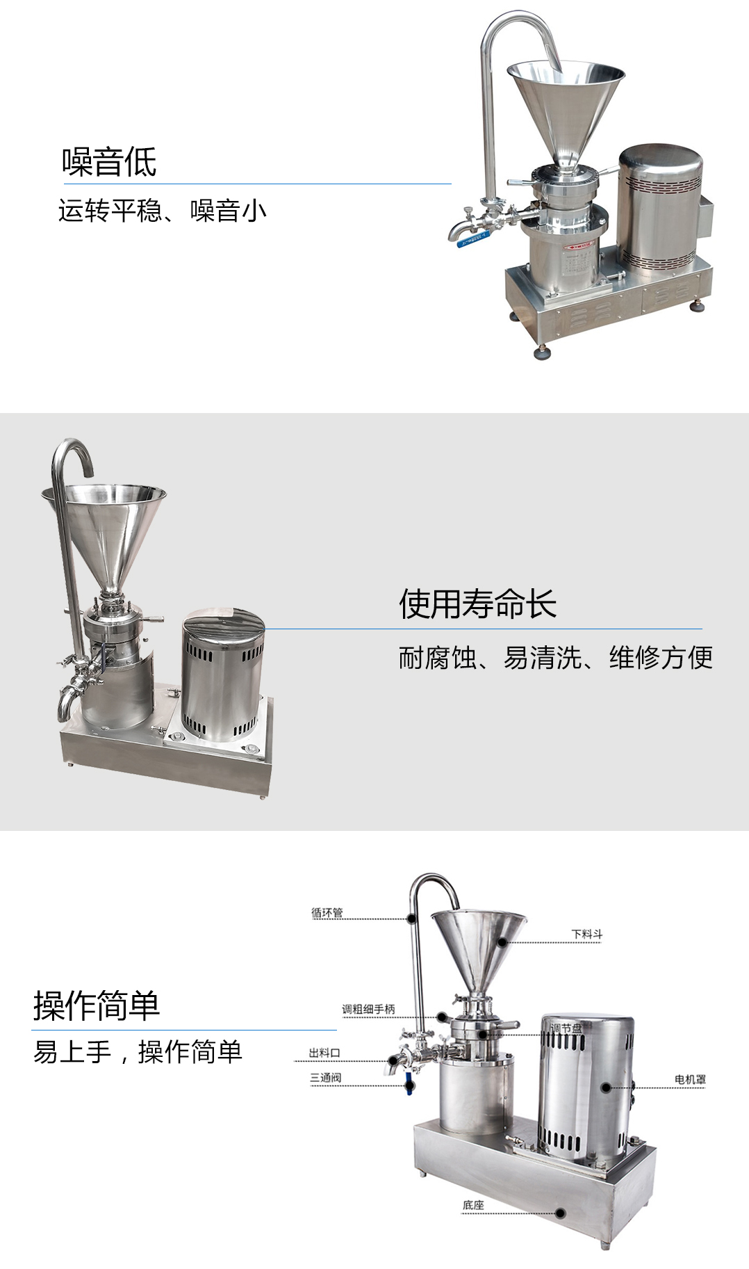 1.該機具有結構緊湊、運轉平穩、噪音小、耐腐蝕、易清洗、維修方便等特點。